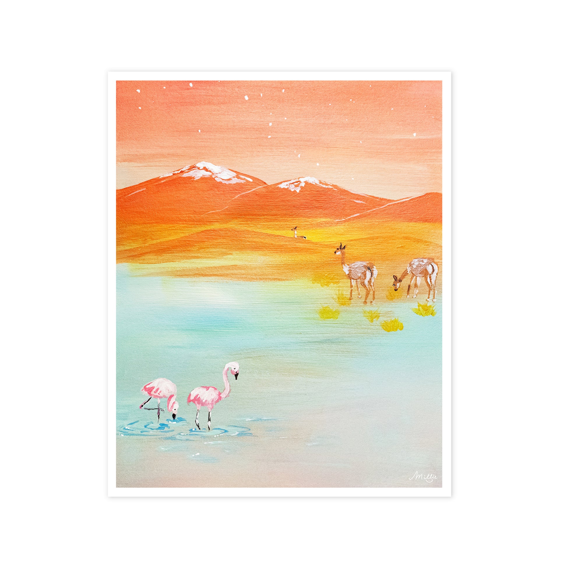 Inspired by a road trip through the Atacama Desert in Chile. Volcanoes painting the background of beautiful flocks of wildlife that scatter the sand.