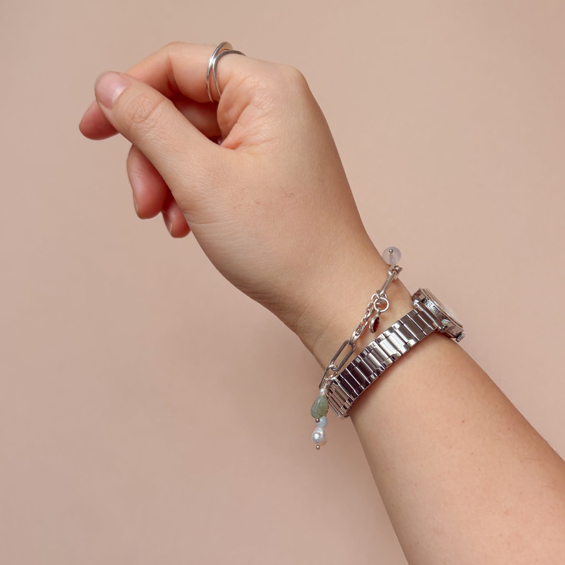 A sturdy chainlink bracelet sprinkled with little gems and charms, perfect to wear on its own or stack it up!
