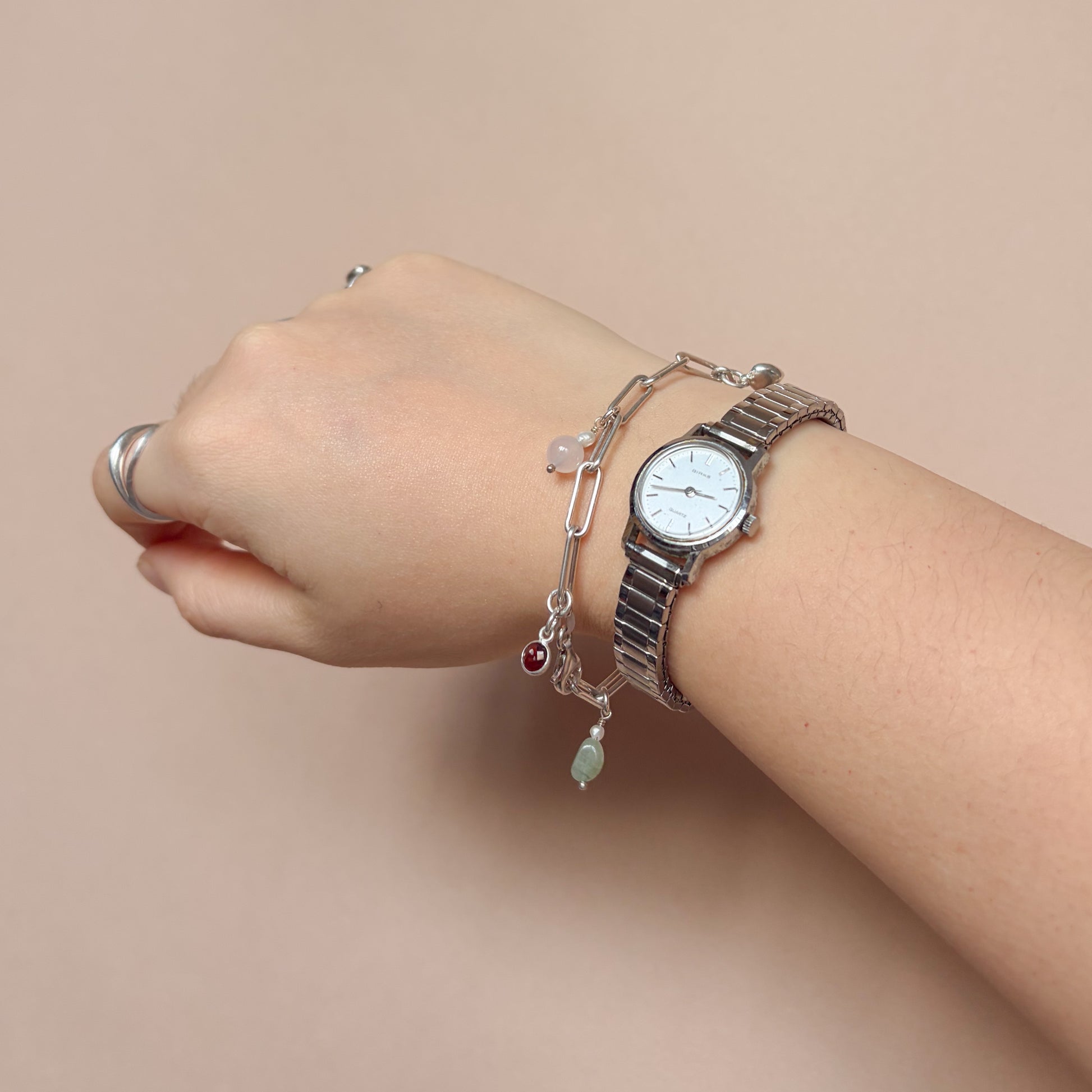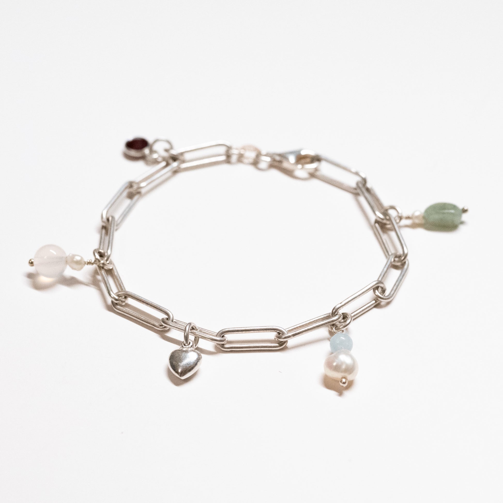 A sturdy chainlink bracelet sprinkled with little gems and charms, perfect to wear on its own or stack it up!