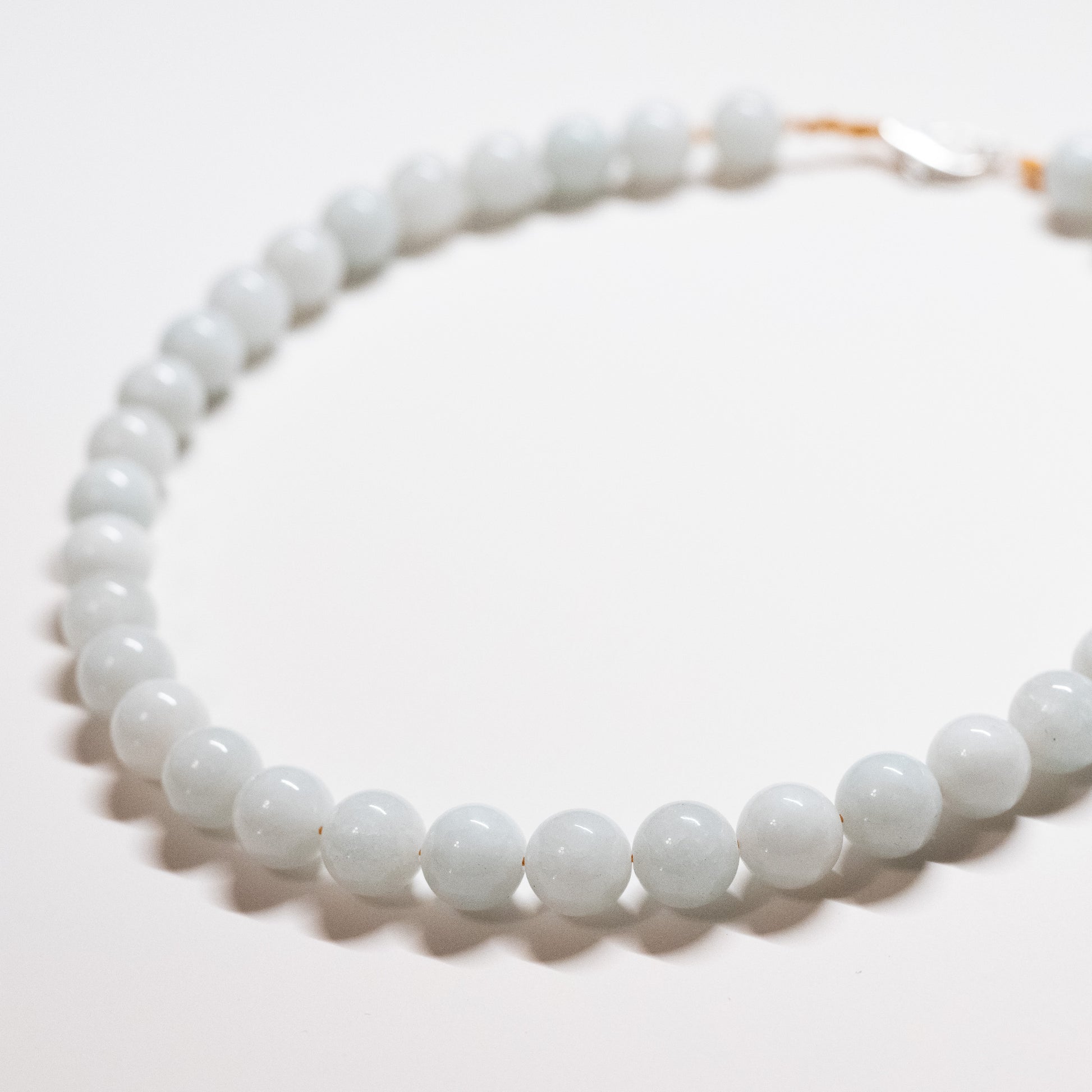 Subtle blue beaded necklace, with a sterling silver clasp in the back.