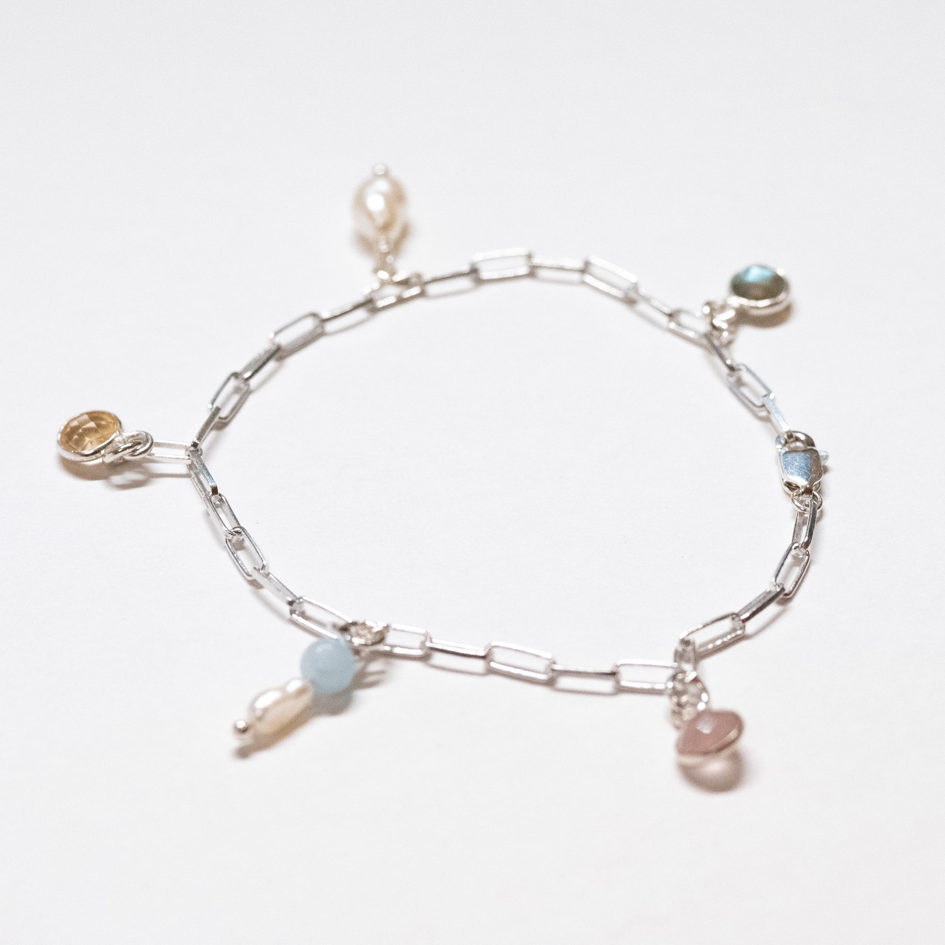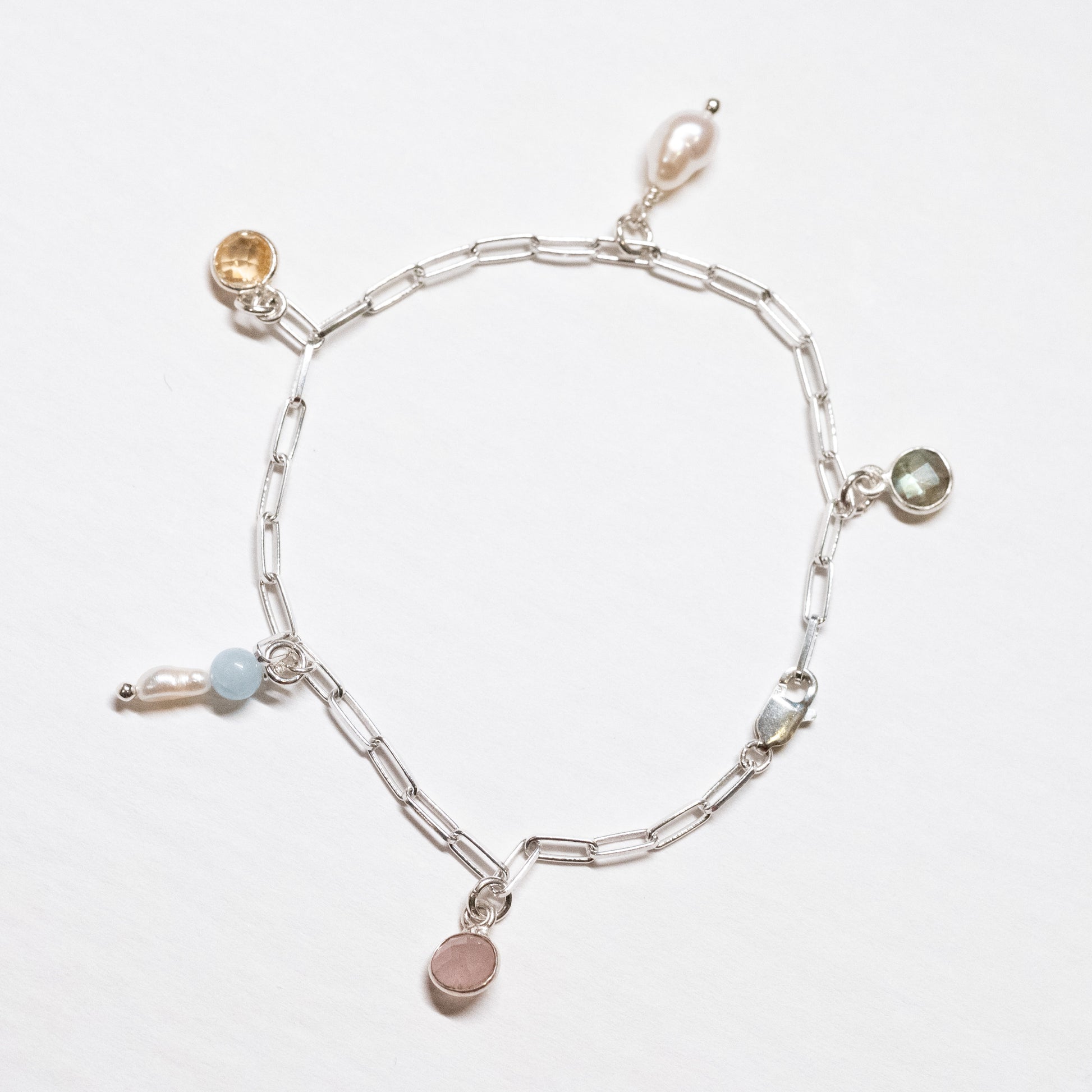 Rose quartz, aquamarine, citrine, labradorite, freshwater pearl, sterling silver.