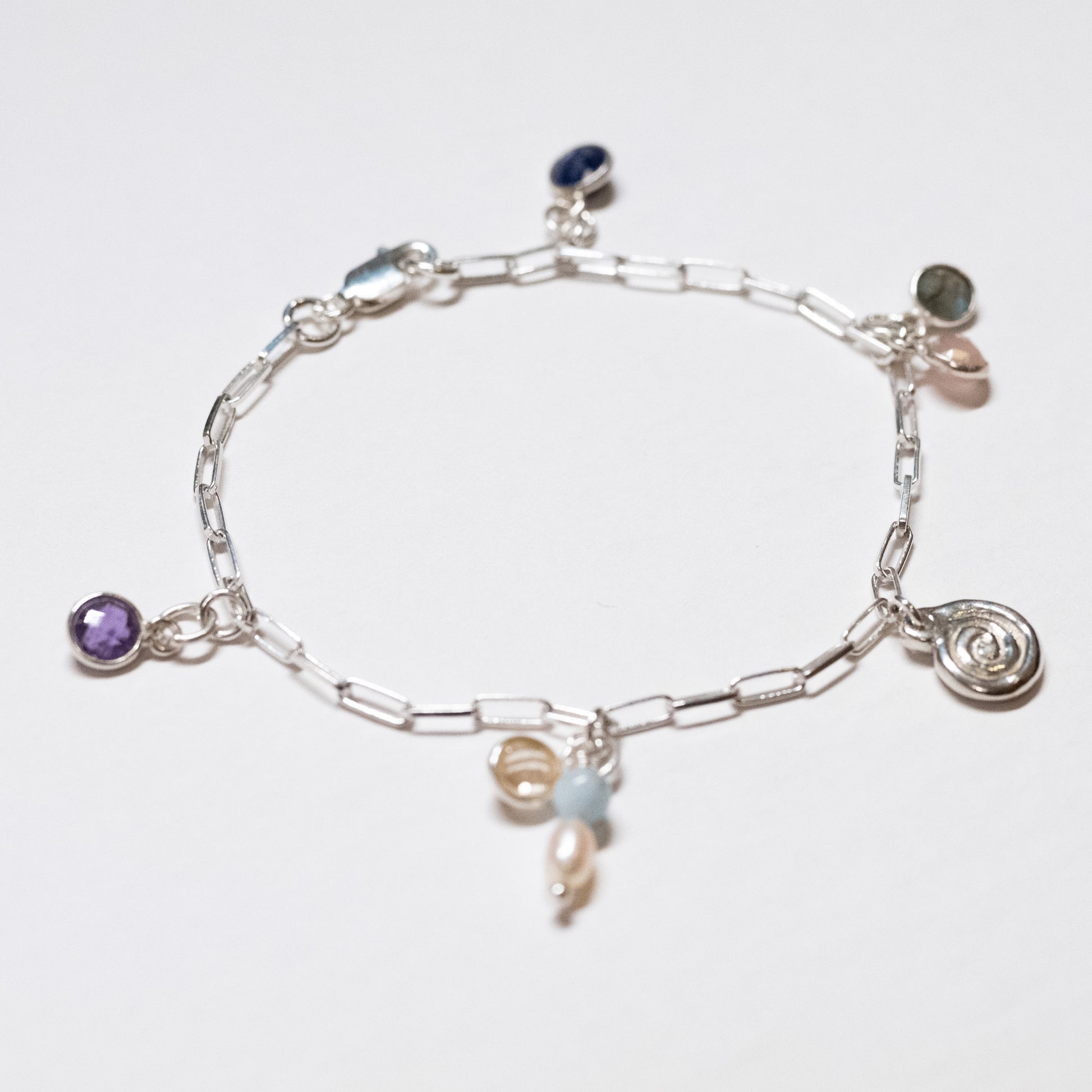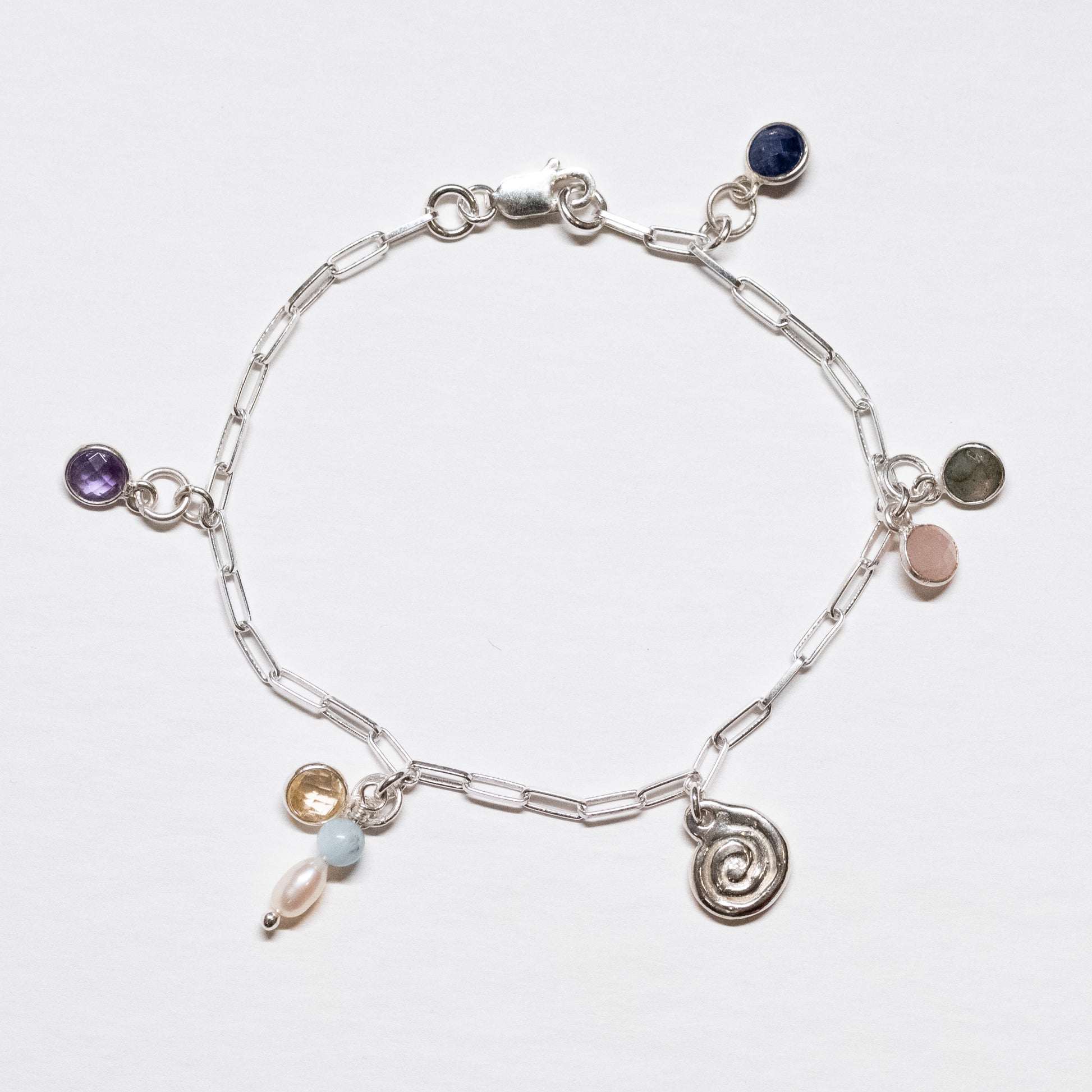 Amethyst, citrine, aquamarine, rose quartz, labradorite, sapphire, freshwater pearl, sterling silver.