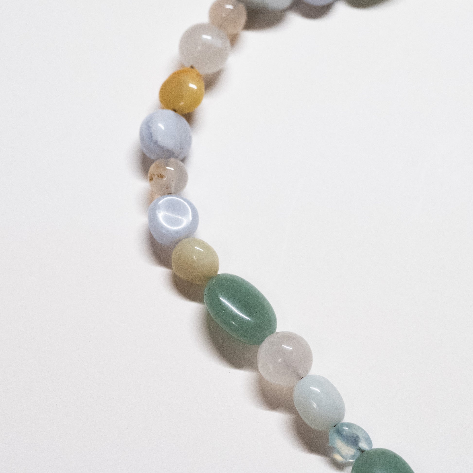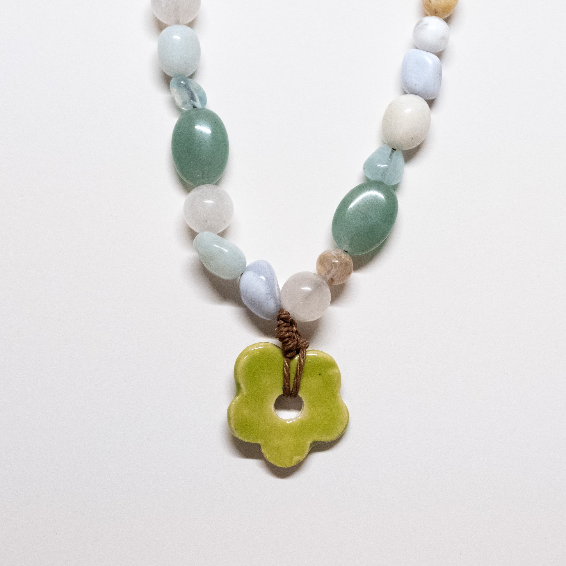 A very special, limited collaboration with ceramic artist, Sarah Taghipour (@sarahtaghipour.art) who handcrafts unique ceramic charms locally in Hamilton, Ontario. This is a colourful, one of a kind piece stacked with aventurine, blue-lace agate, moonstone, and quartz. It features a hand-knotted green ceramic flower charm at its center, guaranteed to brighten up your outfit.