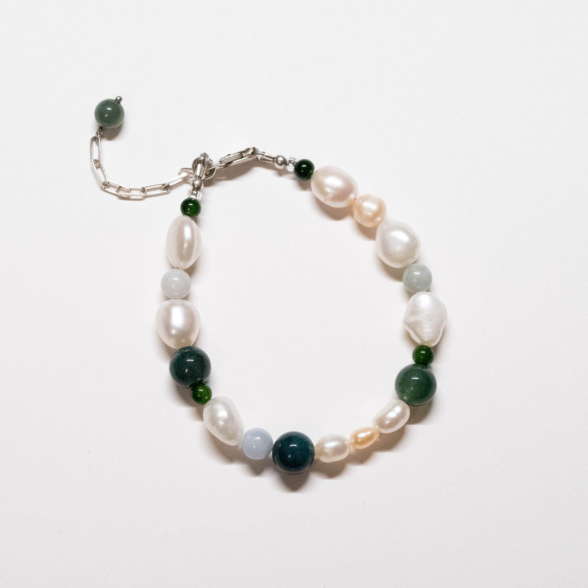 Aventurine, aquamarine, freshwater pearl, sterling silver.