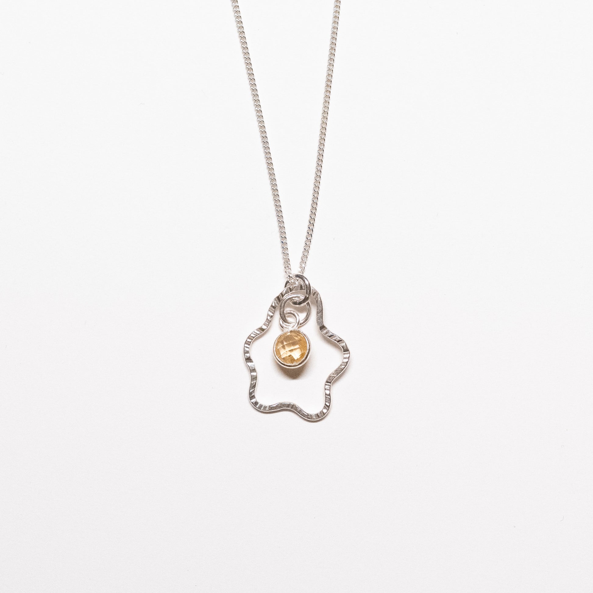Hand-formed and hammer-texture squiggly pendant, featuring a citrine gem in the middle.